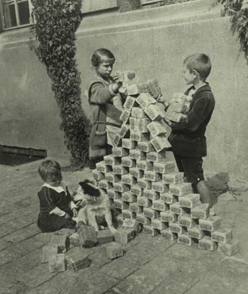 Then Germany proceeded to its descent into hell. Inflation picked up speed when the British demanded reparation in gold of 2 billion goldmarks a year, plus a quarter of their exports. Each year and with each crisis, more money was printed until by late 1923 $1US was worth 4.200,000,000,000 papermarks.